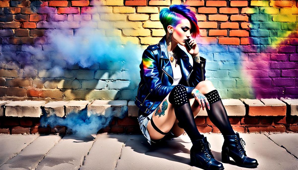 This image shows a young woman with rainbow hair and striking attire, including a leather jacket and fishnet stockings. She is leaning against a brick wall, holding a smartphone and blowing smoke in a watercolor style.