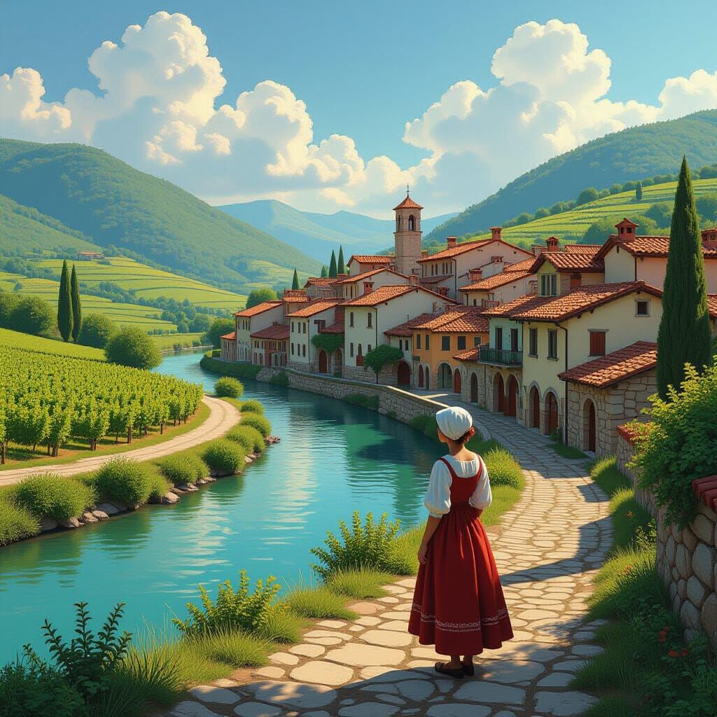 This image shows a quaint Italian village situated among rolling green hills and a tranquil river. A woman in traditional attire stands in the village in this hyperrealistic image with dramatic side lighting.
