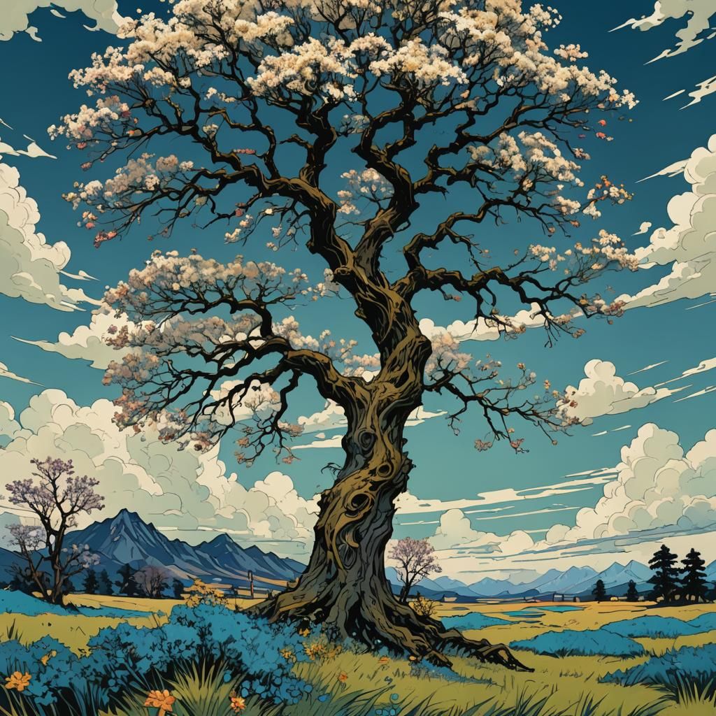 A punk-style willow tree beneath a vibrant spring sky filled with clouds. Wind sweeps through a meadow of flowers in triadic colors, rendered as post-apocalyptic pixel art.