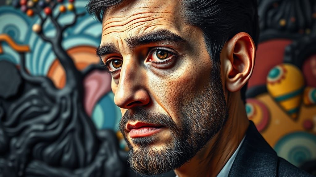 A hyperrealistic splash art concept of a man in chiaroscuro wood sculpture, featuring intricate detail and a colorful, collage-like background with unique textures and patterns.