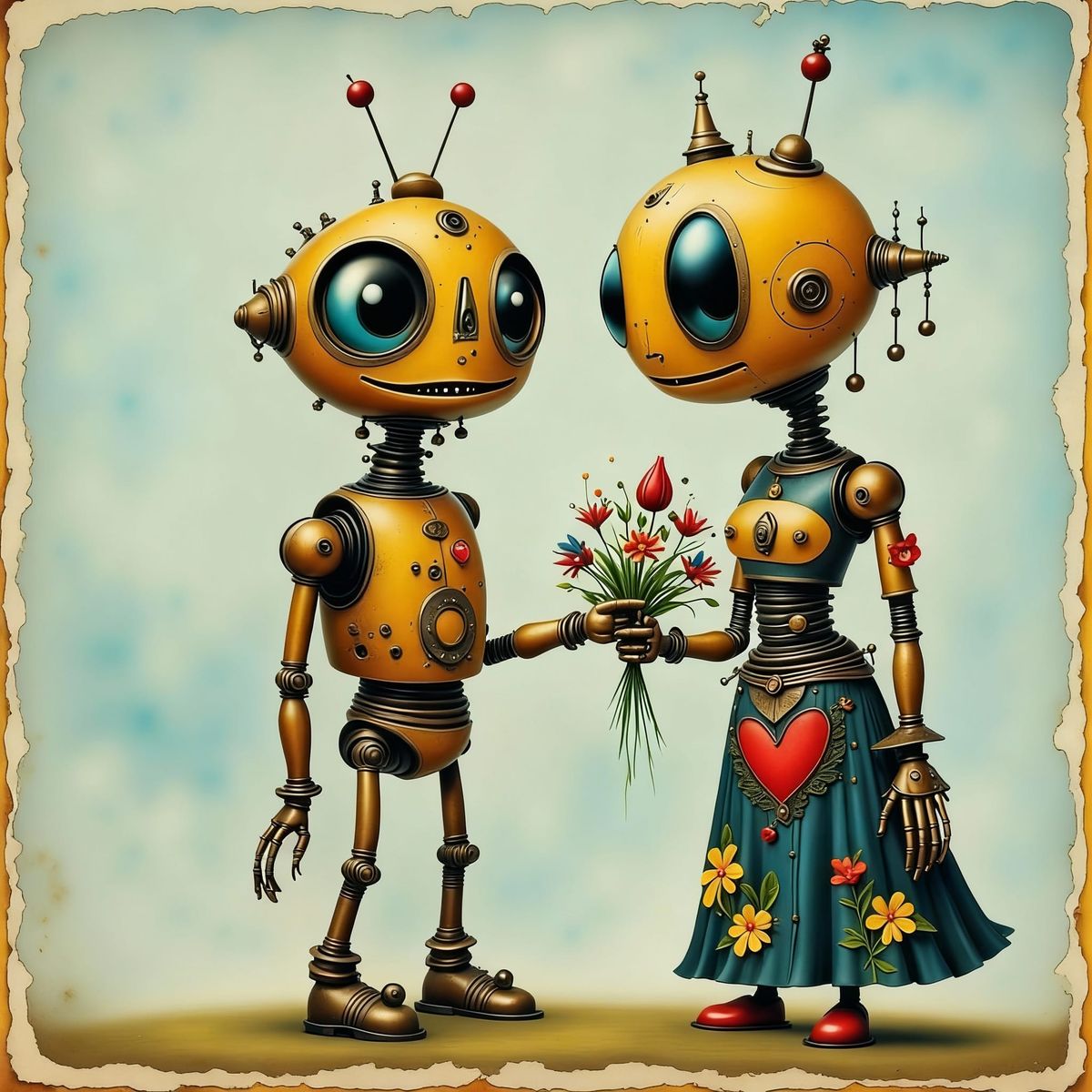 A friendly abstract steampunk robot with large eyes presents flowers on a vintage French postcard, blending retro charm with imaginative artistry.