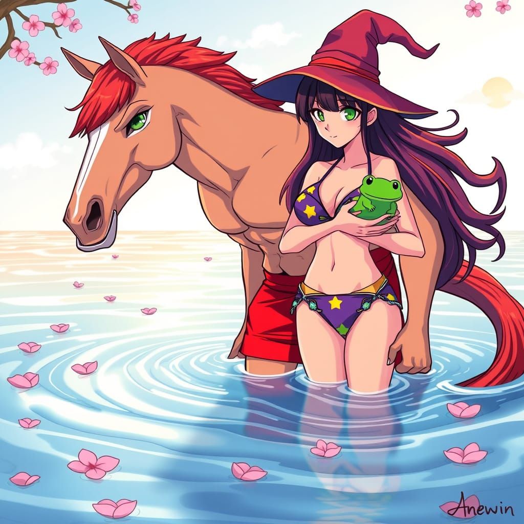 This vibrant anime-inspired artwork features a majestic half-man, half-horse creature standing in the water, surrounded by a young witch and a green frog, amidst a lively scene with cherry blossom petals and a warm morning sun.