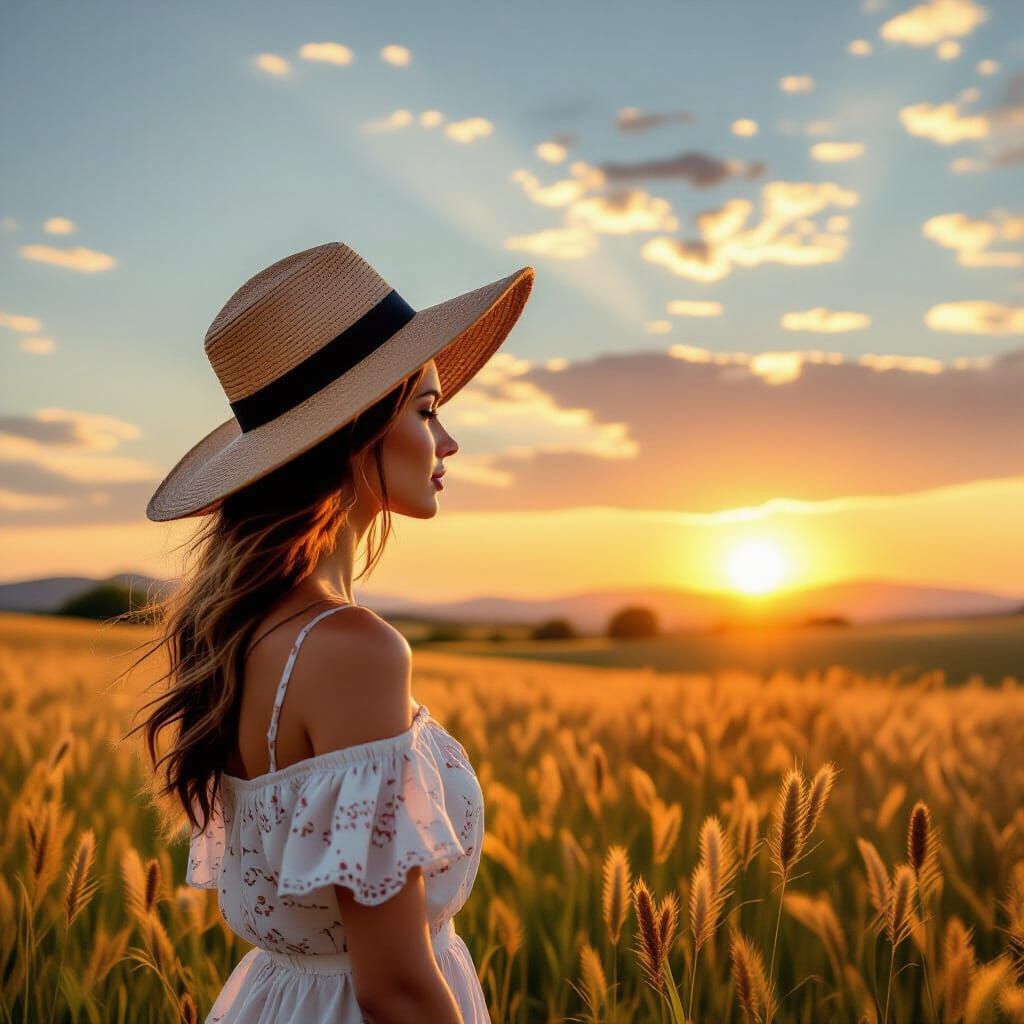 A portrait of a woman in a straw hat gazing at the horizon during sunset. The artwork is reminiscent of colored pencil drawings with fauvist brushstrokes and a warm, inviting palette.
