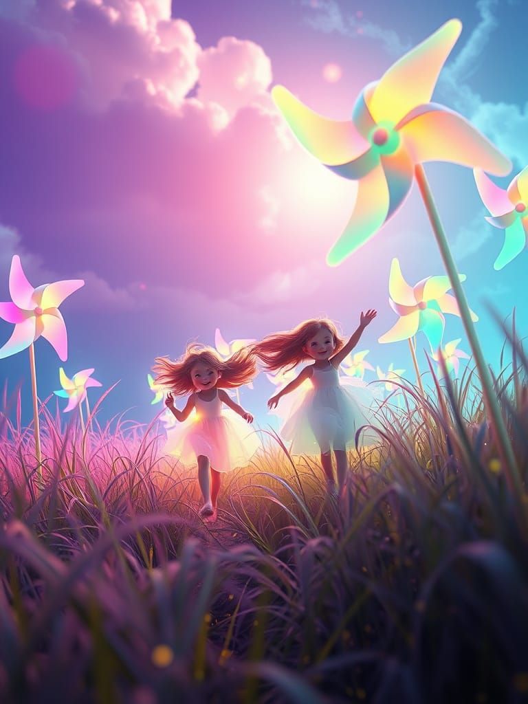 This image shows bioluminescent girls running through a field with tall grass and giant pinwheels. The scene is set in an ethereal atmosphere with bright light rays and dark blue clouds, rendered in a surreal, digital 3D style.