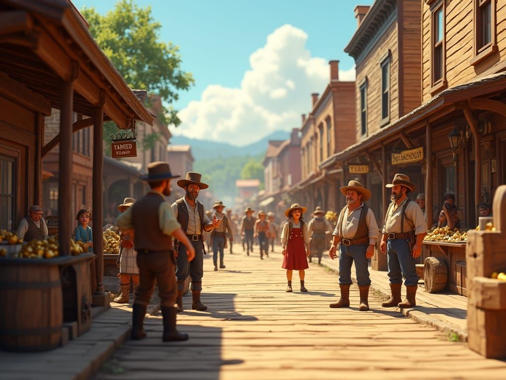 This image captures a bustling 19th-century gold rush town in a lively Pixar style. It features prospectors, merchants, and children on wooden streets, all centered around the allure of gold. Rendered in vibrant 3D with expressive characters.