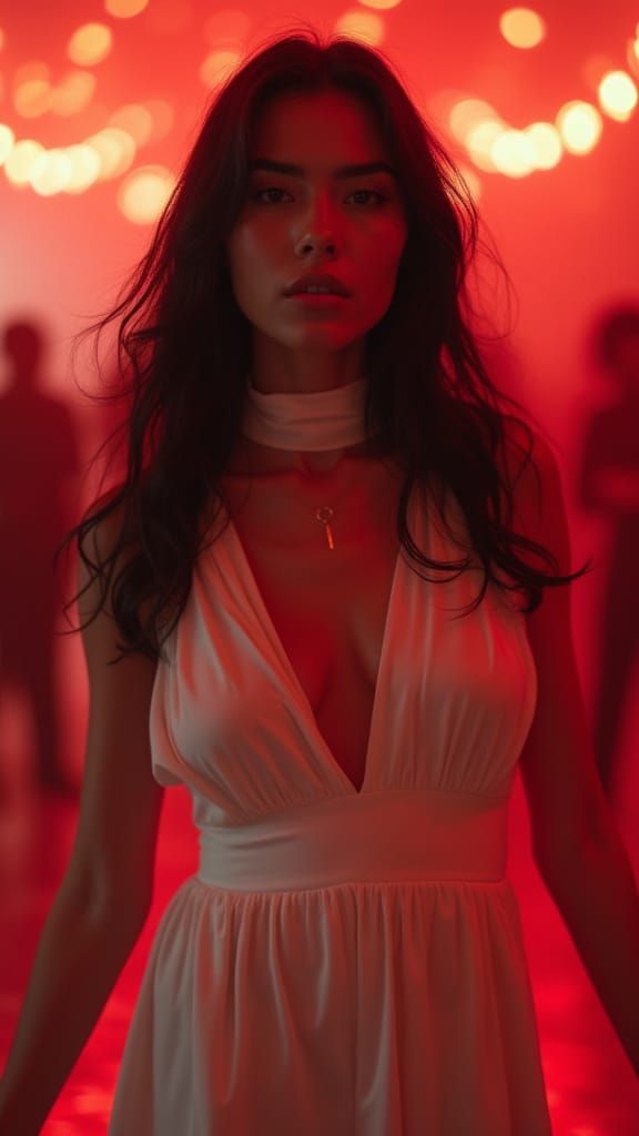 This image captures a woman in a stunning white dress, set against the vibrant backdrop of a dancefloor with marquee lighting, in a cinematic atmosphere with red tones and sharp focus.