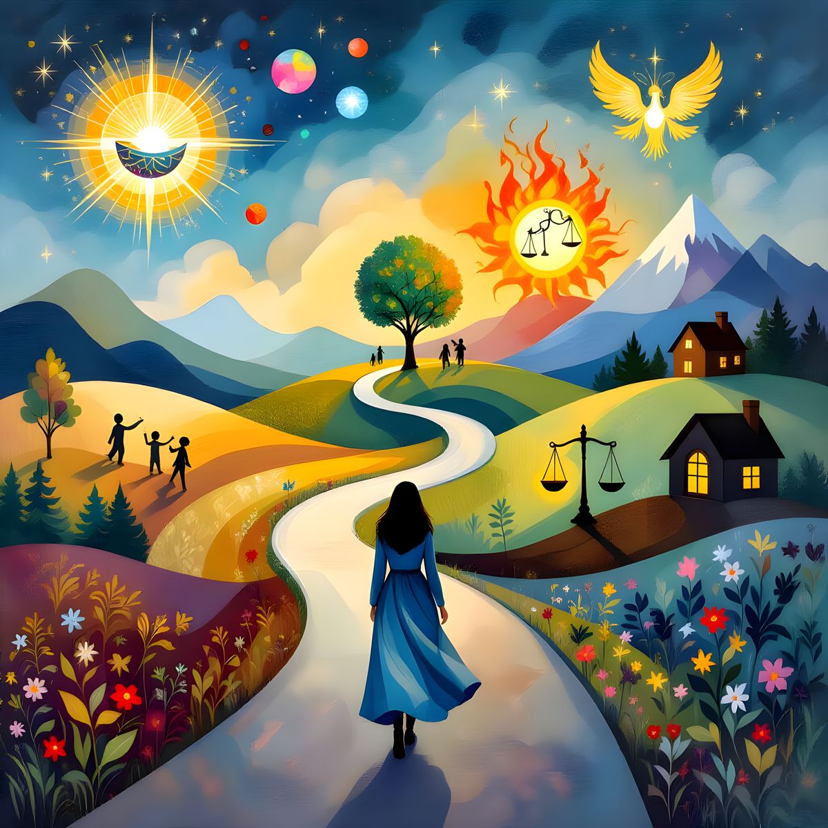 ✨“The Journey of 17 Phases✨ This surreal artwork symbolizes the journey of life through 17 stages. A winding road carries the traveler through fields of growth, balance, family, dreams, challenges, and wisdom. Each symbol along the way – the tree of growth, the scales of balance, the sun of energy, and the bird of transcendence – represents a phase of transformation. The mountains on the horizon remind us that life is both a path of struggle and beauty, ending in wisdom and light.