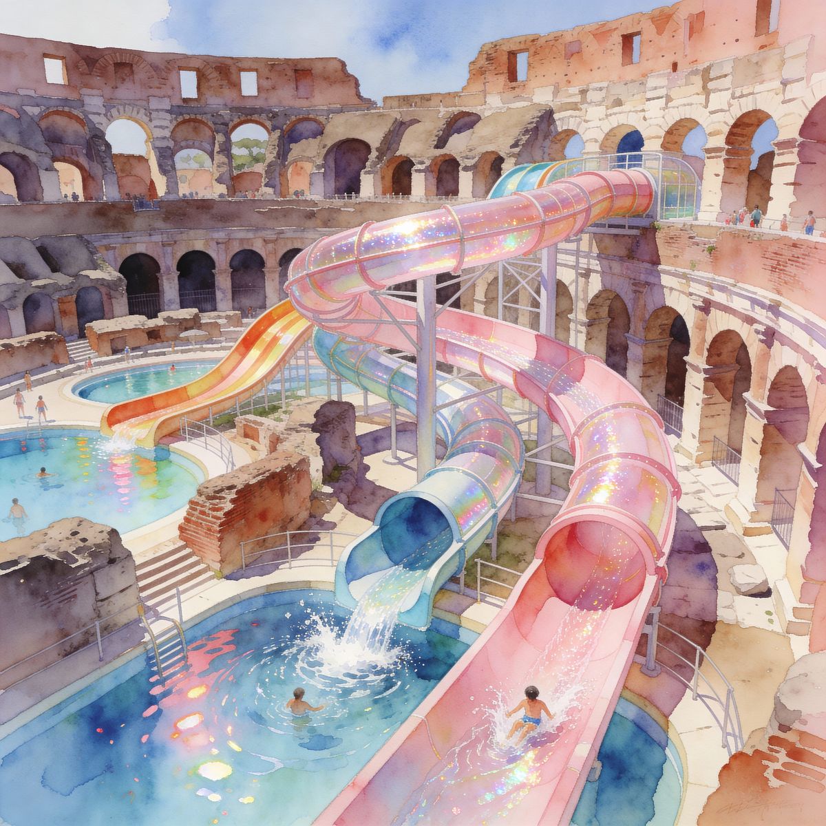 This image depicts a surreal waterpark integrated into ancient Colosseum ruins, rendered with vibrant alcohol ink effects and bright, inviting light. It features twisting slides and colorful pools.
