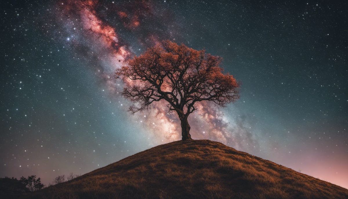 A stunning image of a solitary tree silhouetted against a breathtaking, star-filled galactic sky. The scene captures the serene beauty of nature under a vibrant cosmic display.
