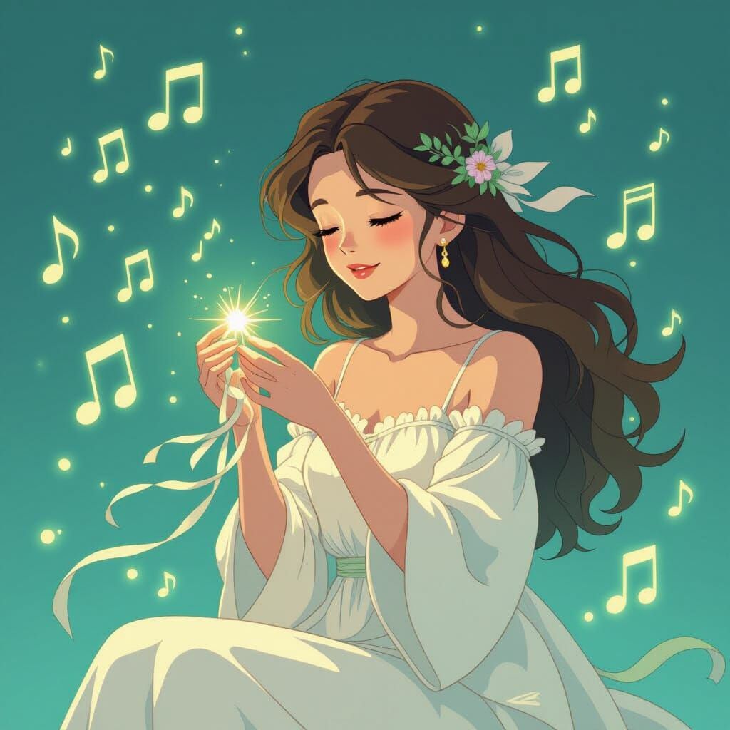 This image shows a woman in a white dress humming as she unties a seaweed knot. Musical notes glow around her, in a whimsical, dreamy style with soft, ethereal lighting.