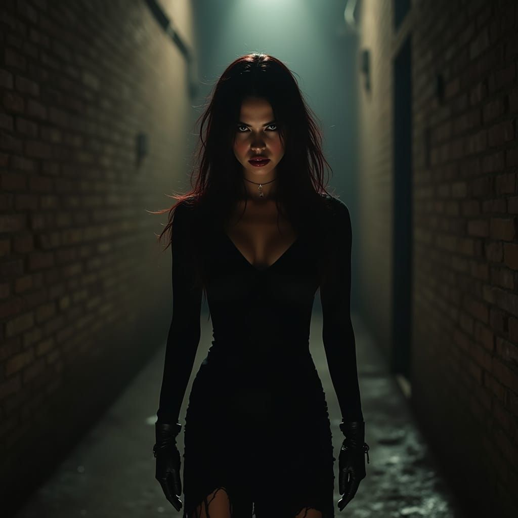 A vivid image of an angry woman standing in a dark alley. Her intense expression is captured with bold, emotive strokes, creating a gritty, high-contrast scene with dramatic lighting.