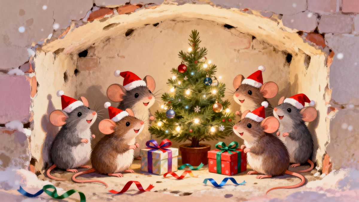 This image shows adorable mice joyfully celebrating Christmas inside a house, surrounded by a decorated tree and gifts, bathed in warm, soft light.