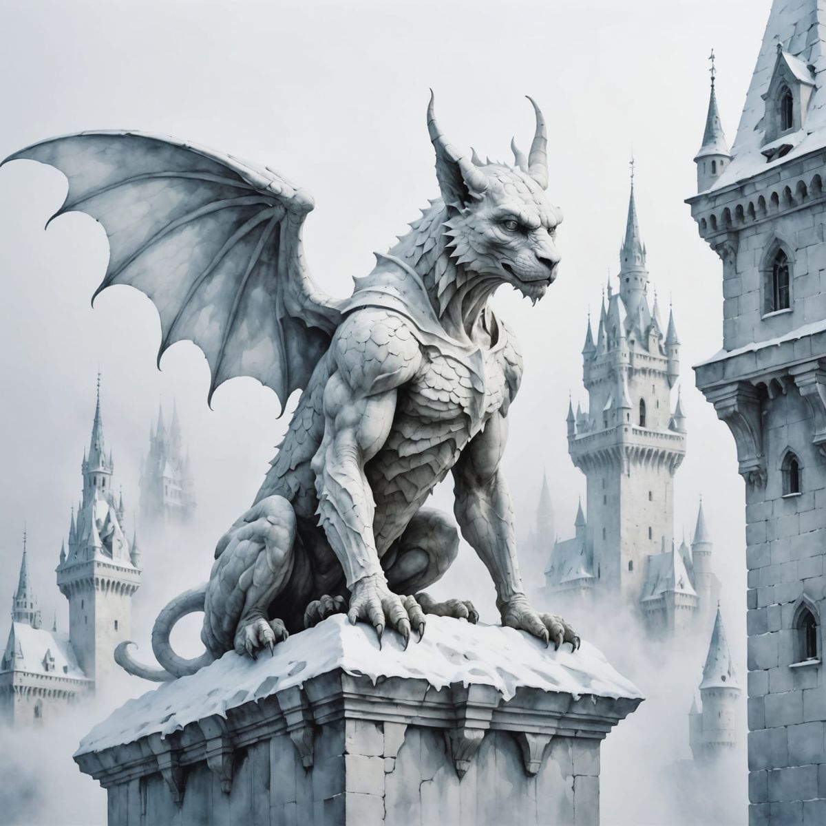 This image shows a white gargoyle perched on a castle wall, shrouded in fog above an abyss. The artwork employs a surreal watercolor aesthetic, emphasizing a monochromatic palette.