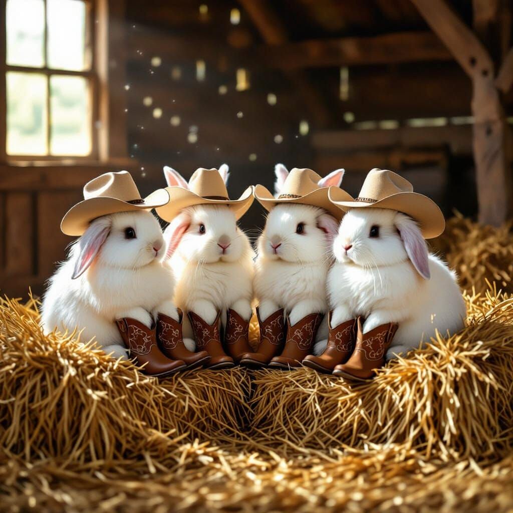 This image shows four fluffy white rabbits dressed in tiny cowboy boots and hats, sitting on hay bales inside a rustic barn. The illustration style is whimsical and detailed, reminiscent of classic storybook art.
