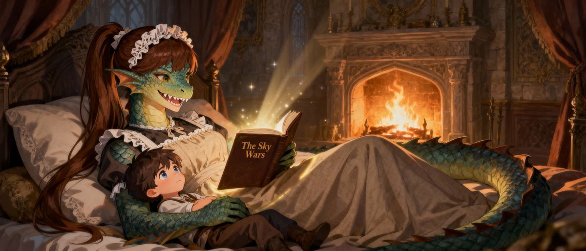 A high-resolution fantasy illustration of an anthropomorphic dragon maid reading a book to a young boy in a castle bedchamber, featuring cinematic lighting and a tranquil atmosphere.