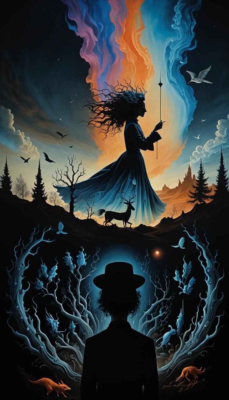 A surreal, dreamlike image of a person recollecting their dreams. The artwork blends organicpunk biometric styles with bright, dynamic lighting and a dark, muted color scheme, reminiscent of surrealist painting.