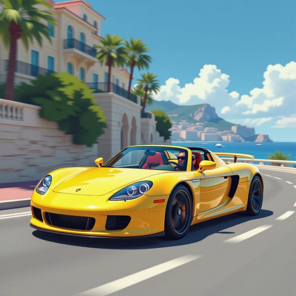 A vivid image of a yellow Porsche Carrera GT driving through Monaco on a sunny day. The artwork captures the scene with vibrant colors and sharp lines, in a futuristic style.