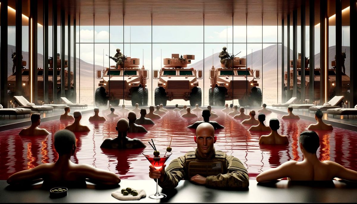 Sip your cocktail, soldier. The pool runs red with luxury and something darker. Outside, armored beasts stand guard over a desert of silence, while inside, bodies soak in opulence dyed crimson.