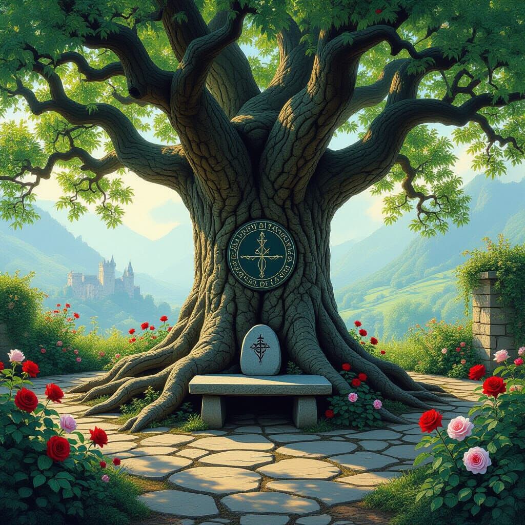 This image shows a mystical Celtic memorial in a castle garden, featuring an ancient oak surrounded by Ogham stones and a stone bench. The scene evokes ancient mystery and tranquility, rendered in detailed atmospheric fantasy art.