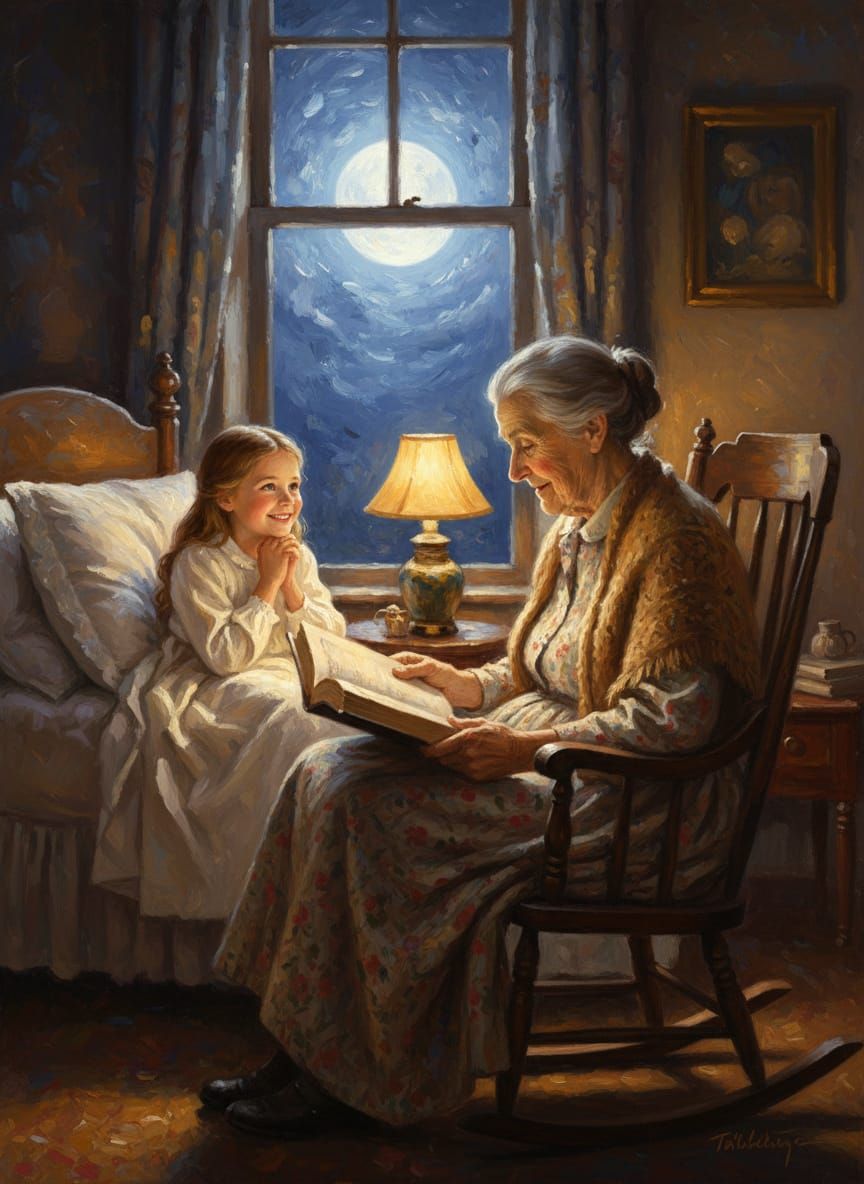 An intimate scene of an elderly woman reading to her granddaughter by the soft glow of moonlight. Rendered in an expressive oil painting style with rich impasto textures.