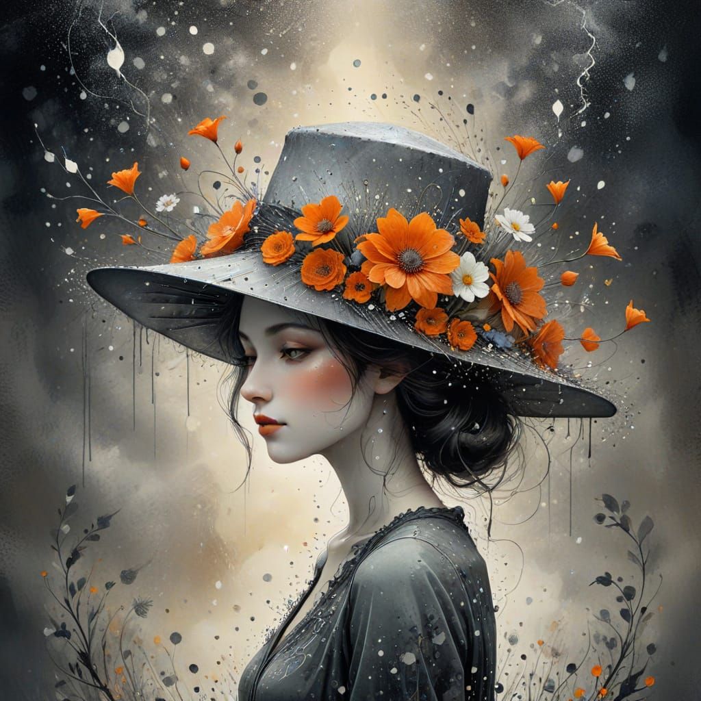 This image shows a detailed watercolor and ink splash art portrait of a mysterious woman wearing a flower-adorned hat, set against a dusky silver light with orange and silver particle rain.