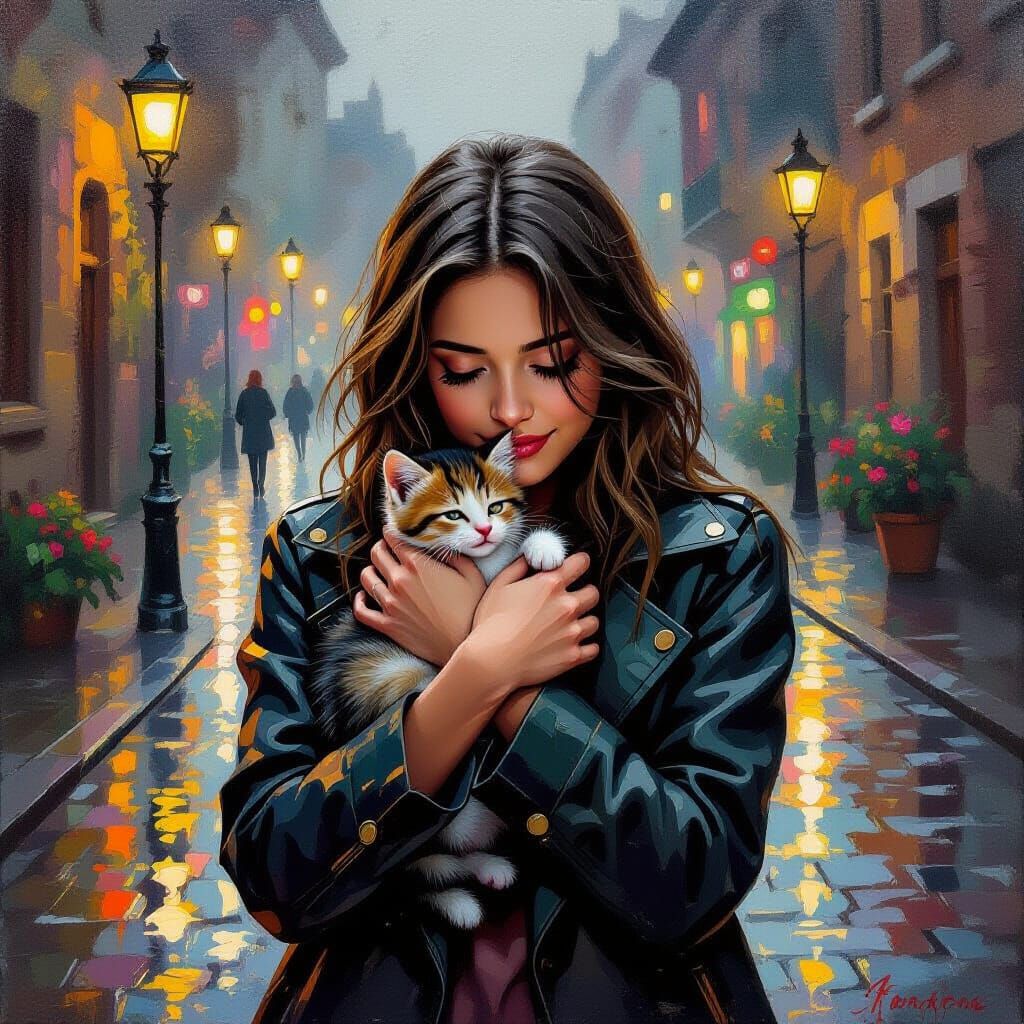 This image shows a woman holding a kitten with tender joy on wet cobblestone streets. Rendered as a textured impasto oil painting with warm, soft lighting and vibrant colors.