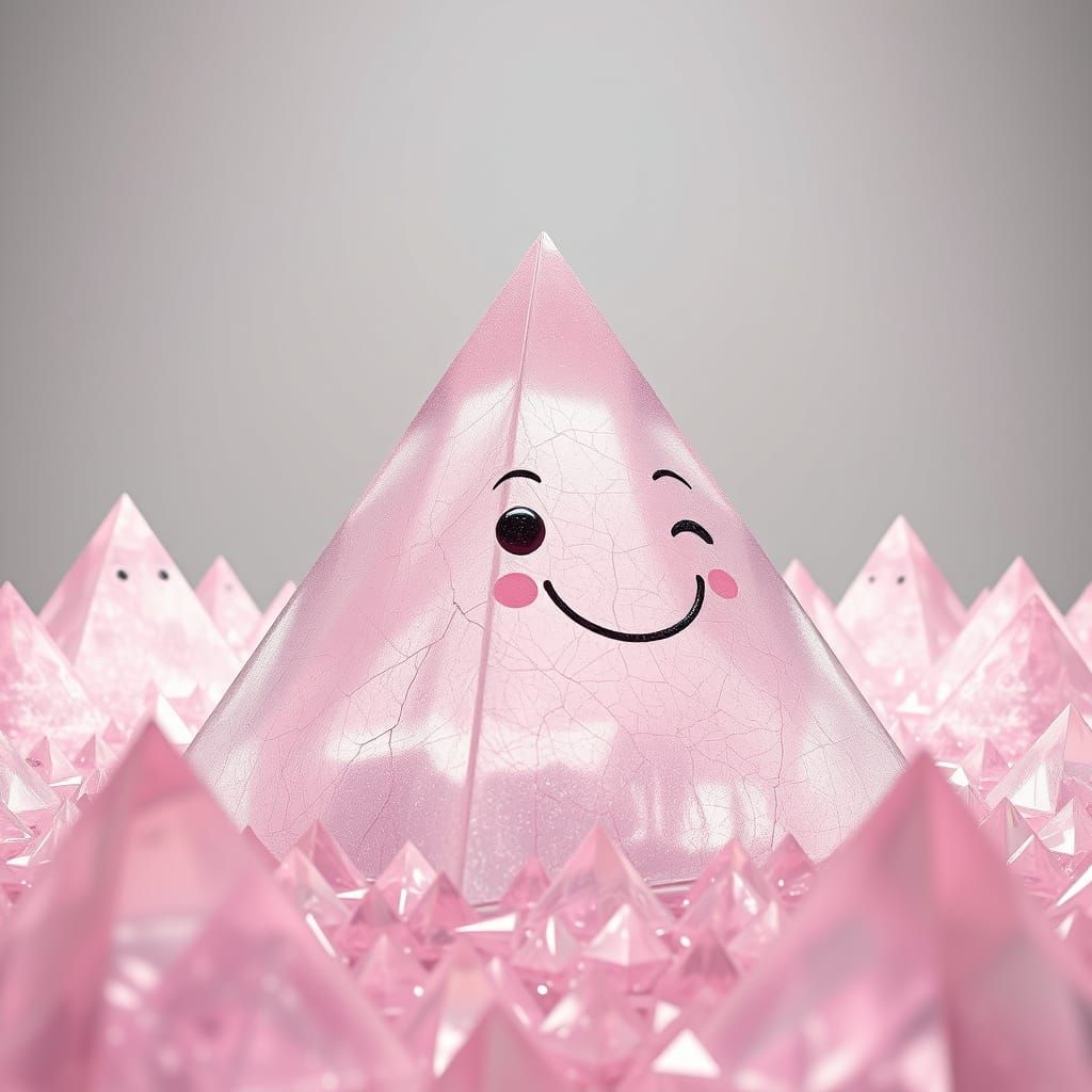 A hyperrealistic CGI rendering of a colossal, cracked, translucent pink pyramid with an eye and smiling face. The pyramid spews forth tiny replicas of itself in a plastic dreamscape, rendered with vibrant colors.