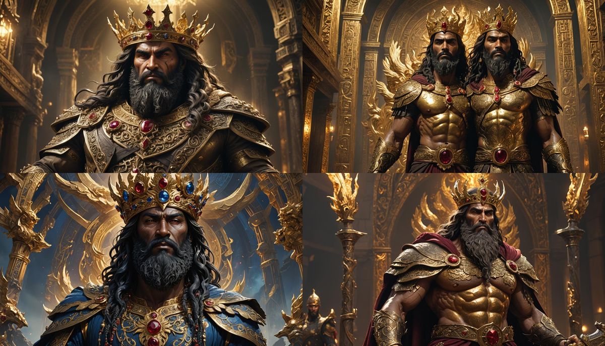 A striking picture of a large bronze-skinned god with a dark beard and raven hair, adorned with a gold and ruby crown. This fantasy concept art features complementary colors and intricate detail in 8k resolution.