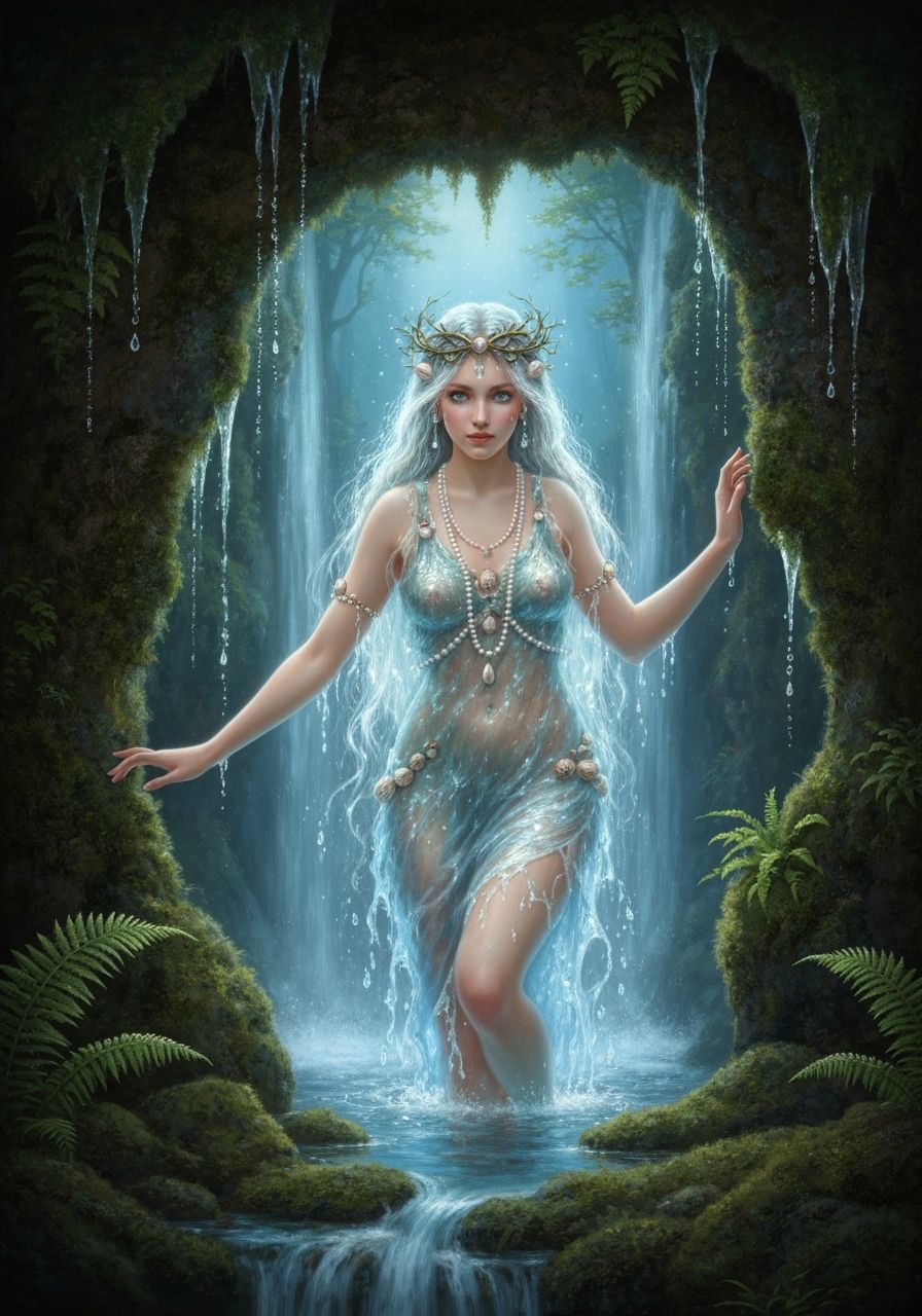 A Pre-Raphaelite style image of a Celtic water nymph with long blue hair. She is adorned with pearl jewelry and seashells, and emerges from a waterfall grotto in soft twilight.
