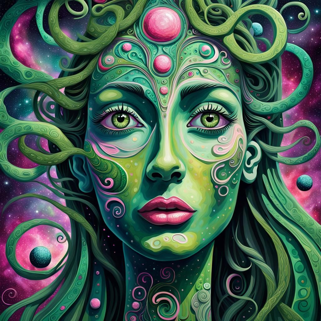 A striking picture of a giant green woman gazing in wonder at a cosmic universe. This psychedelic artwork features bold textures, triadic colors, and art deco accents, rendered with intricate details.