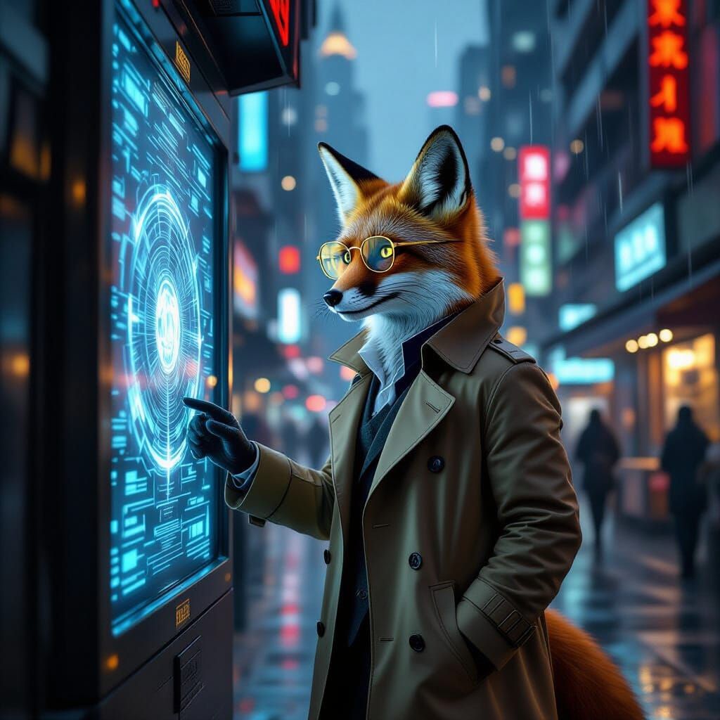 A hyperrealistic image of an anthropomorphic fox in a trench coat and glasses in a futuristic market. The image blends realistic and elegant styles with sci-fi elements, creating a suspenseful cyberpunk aesthetic.