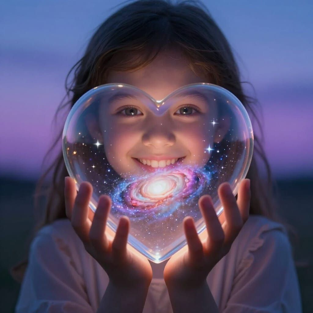 A cute girl smiles holding a transparent glass heart with a swirling galaxy inside. This fantasy digital painting features soft lighting and intricate detail, with cosmic light illuminating her face.
