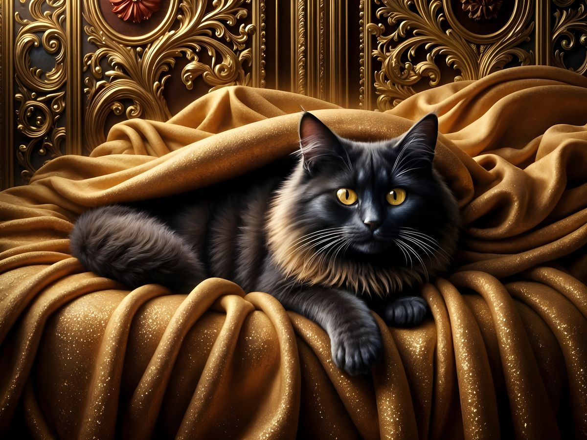 This image shows a long-haired golden black cat resting on a velvet couch. The scene is rendered in a classical renaissance style with rich, metallic gold textures and high contrast, creating an opulent and decorative effect.