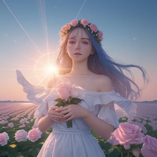This image shows a vibrant scene of a May rose under a blue sky, bathed in sunshine. The image evokes a sense of love and magic, rendered with realistic, cinematic photography.