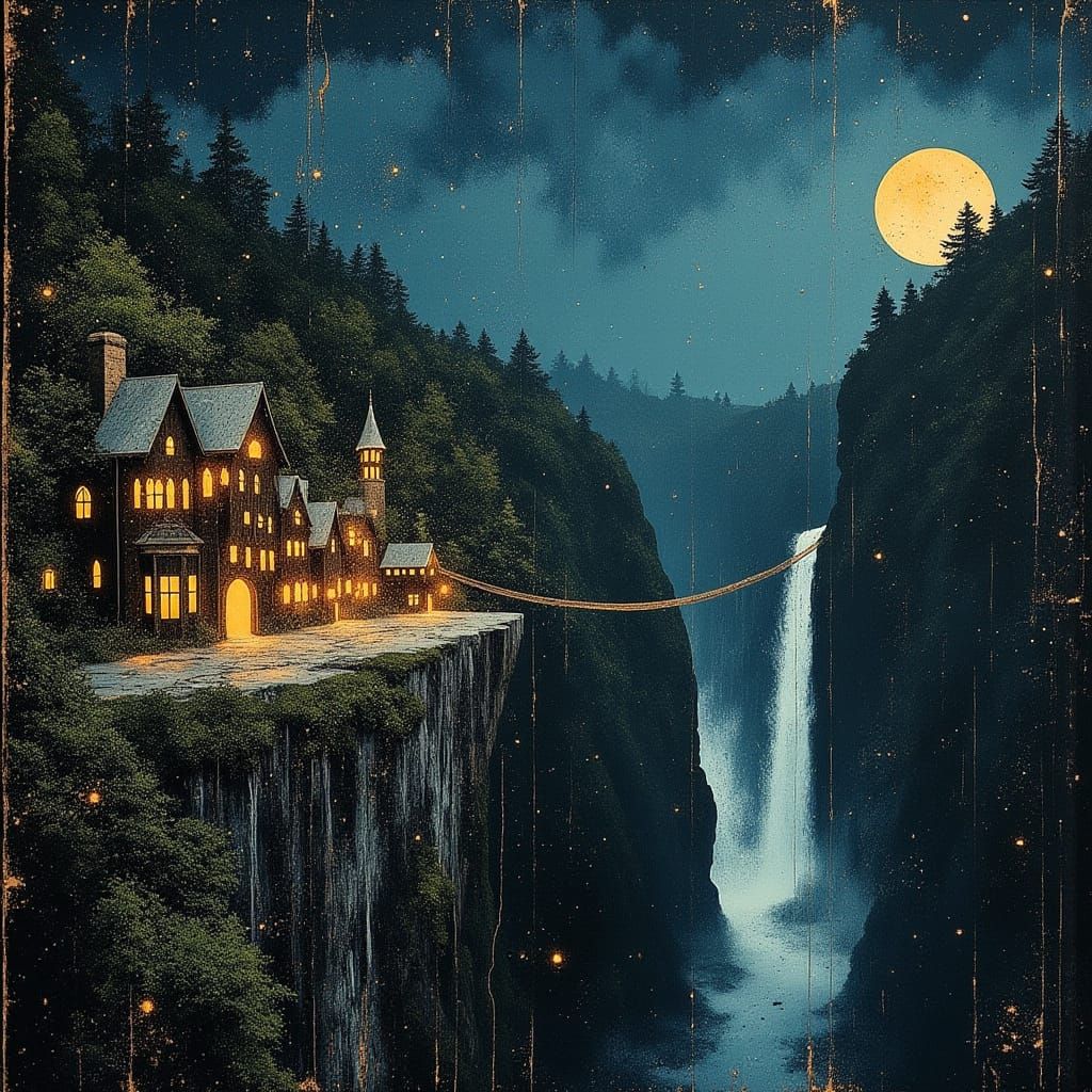A digital painting of a medieval town built into cliffs within an ancient forest. The town features timber buildings, hanging bridges and waterfalls under a starry night sky in a fantasy art style.