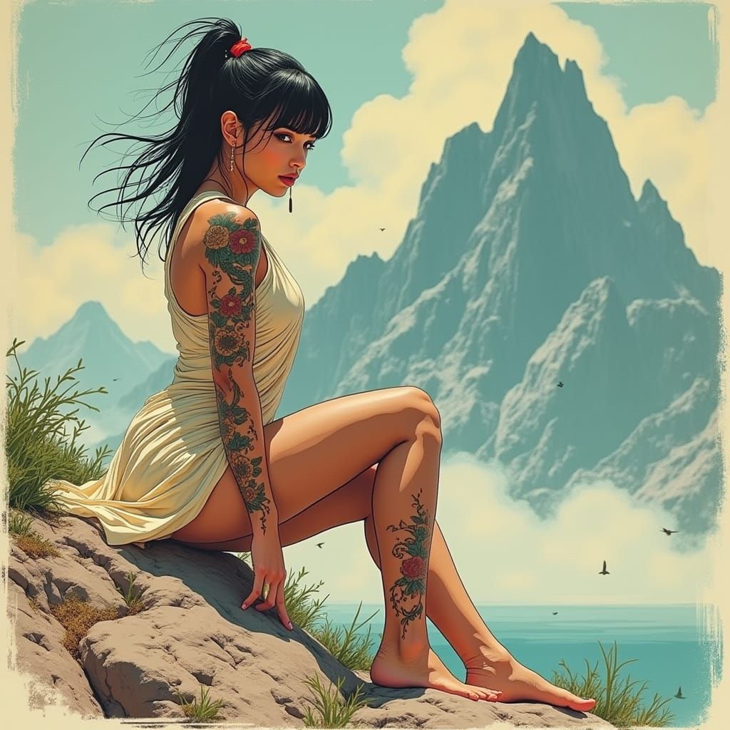 A risograph-style image of a cyberpunk woman with yakuza tattoos standing confidently before a mountain. The artwork features a grainy texture and misaligned color layers in a dystopian futuristic style.