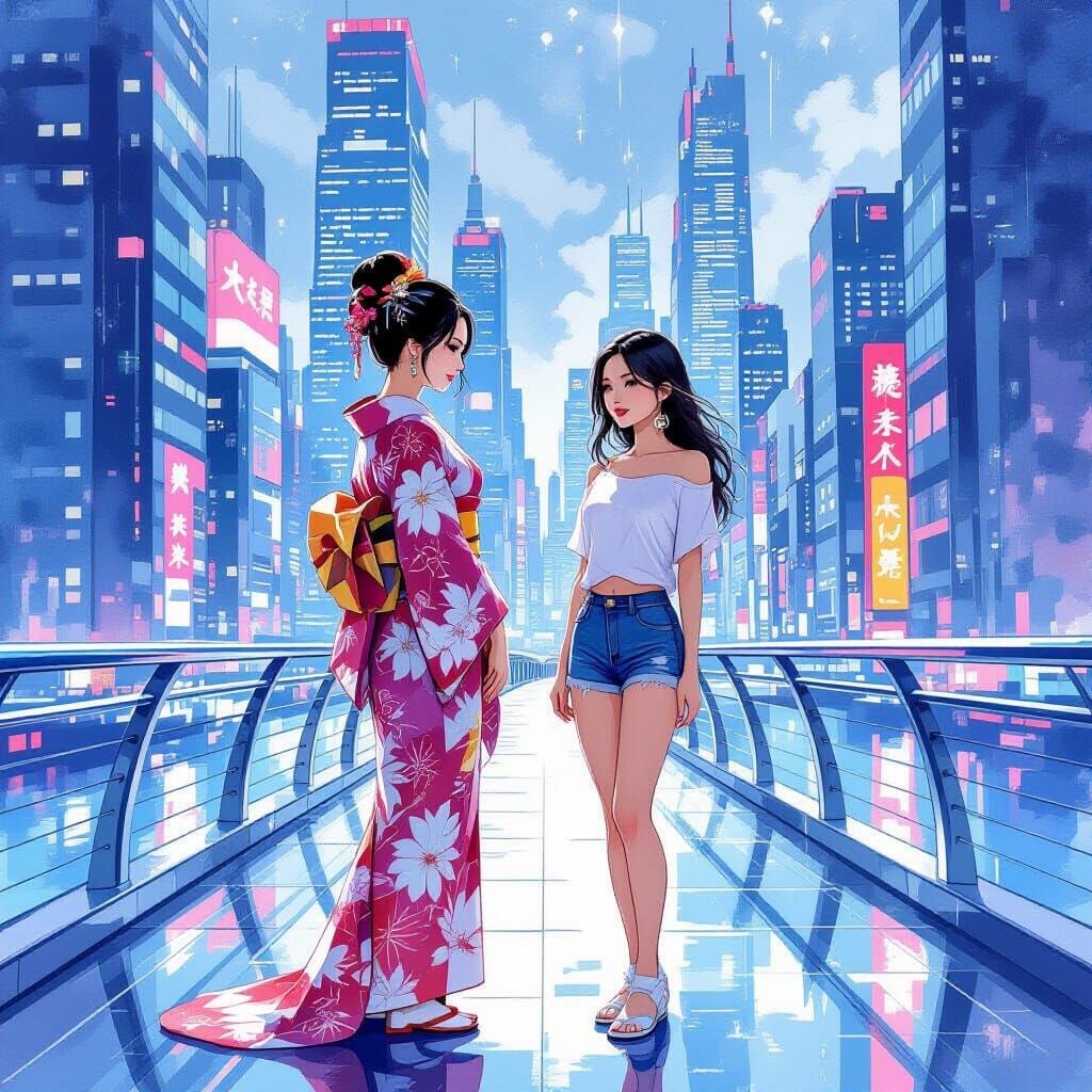 This image shows a kimono-clad Japanese woman and a modern Asian woman standing on a futuristic bridge. The vibrant watercolor art style features bold brushstrokes and blended colors.