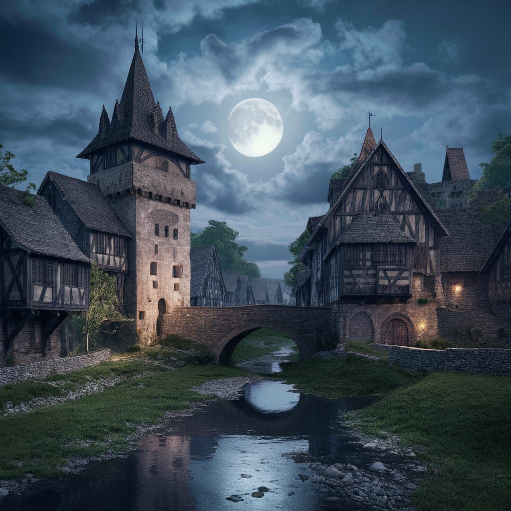 A tranquil medieval village bathed in moonlight, its cobblestone streets softly illuminated by silvery reflections from a serene river winding through the town. A stone bridge, weathered yet enduring, arches gracefully across the water, connecting both sides of the quiet settlement. Thatched-roof cottages and timber-framed houses line the riverbanks, their windows glowing faintly with candlelight. The moon hangs high in a velvety sky, casting gentle highlights on the rooftops and the rippling water below. Wisps of mist drift along the river, and distant hills form shadowy silhouettes on the horizon. The atmosphere evokes timeless calm, nostalgia, and quiet mystery, as if the village itself holds ancient stories whispered only to the night.