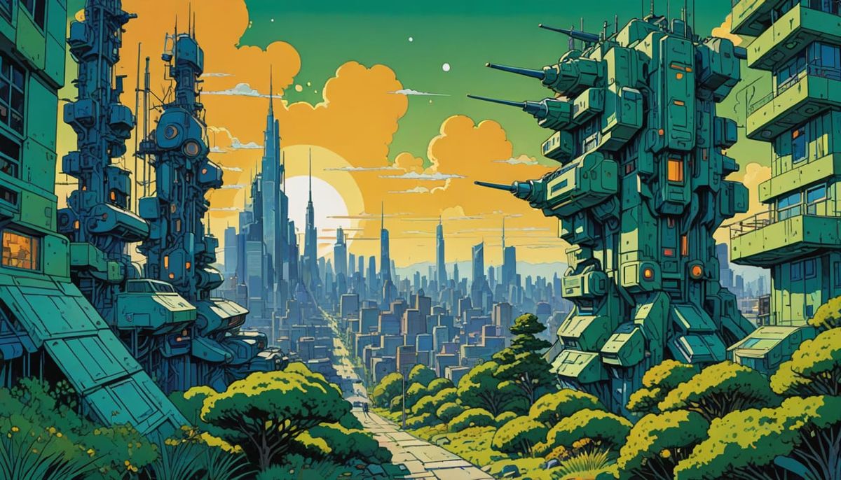 This image shows a Gundam in Tokyo, rendered in a comic book style with watercolor effects. It features mossy green mechanical details and an indigo blue shaded metallic surface under bright sunlight, creating a cheerful, futuristic atmosphere.