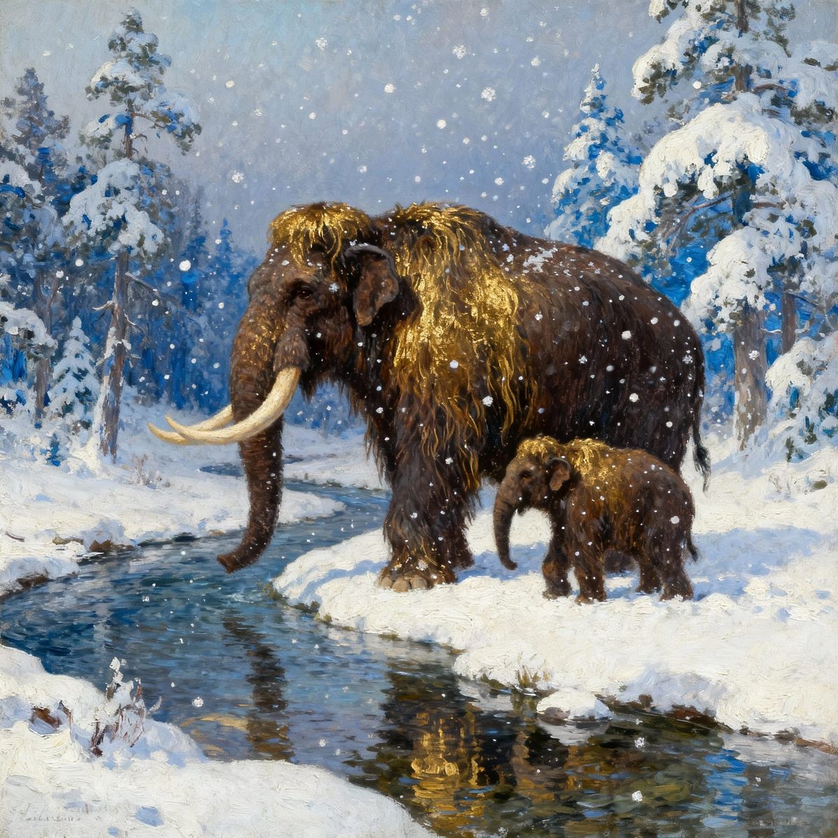 This image shows a serene oil painting of a woolly mammoth and calf by a stream in a snowy winter scene. The textured brushstrokes create a peaceful atmosphere with realistic lighting.
