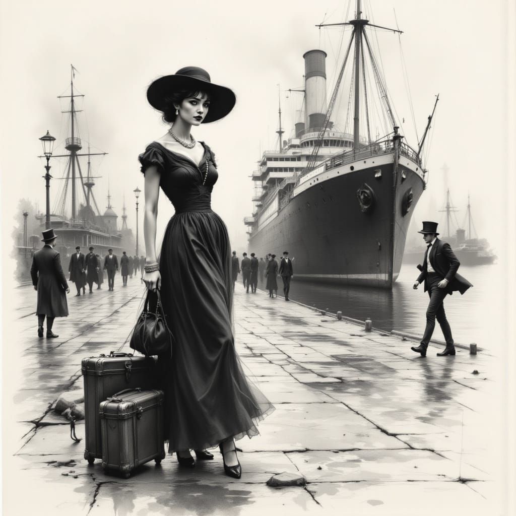 This 3D pencil sketch captures an elegant woman from the early 20th century on a wet dock with vintage suitcases and a steamship. Features soft shading and a dramatic perspective.
