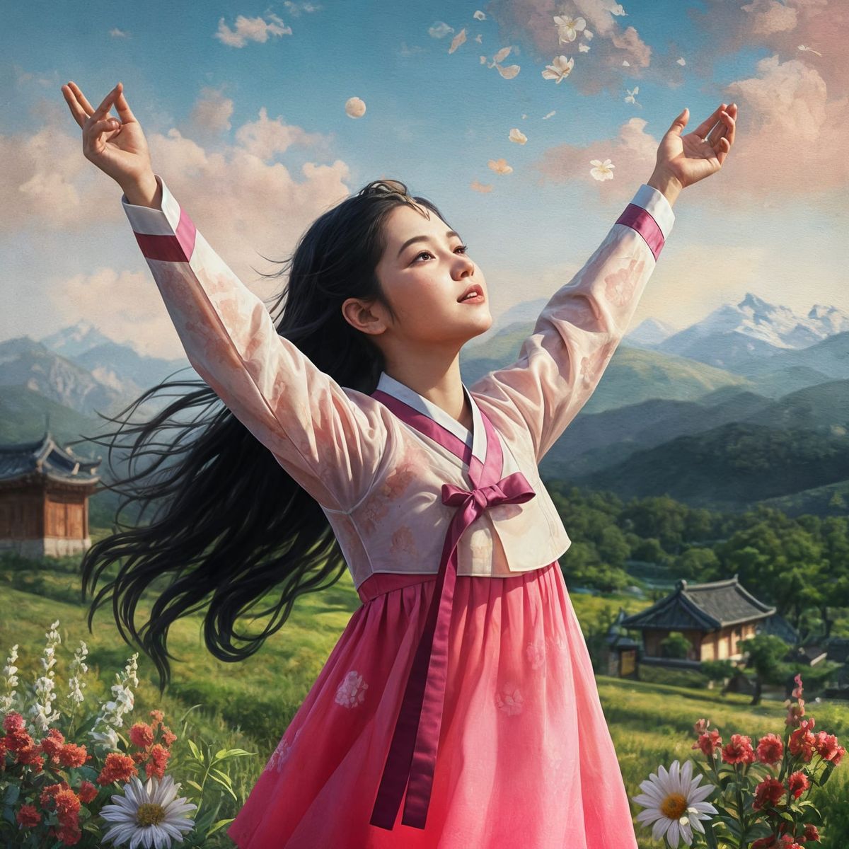 This image shows a beautiful Korean girl in a stunning hanbok, surrounded by flowers and set against a vibrant, textured mountain backdrop, blending realistic oil painting and 3D rendering techniques.