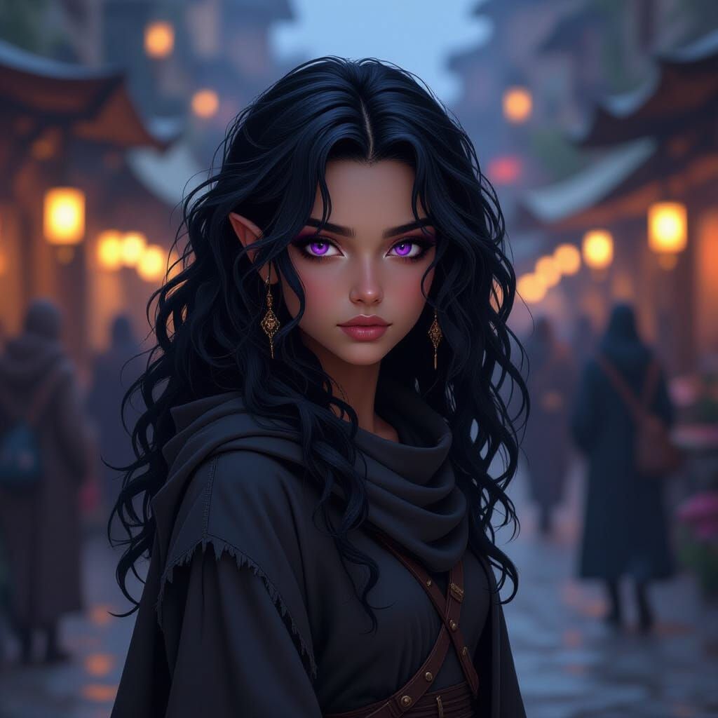 A captivating image of a half-drow girl in a bustling night market, shrouded in shadows and intrigue. The scene is rendered with ornate detail and moody lighting, reminiscent of art nouveau.