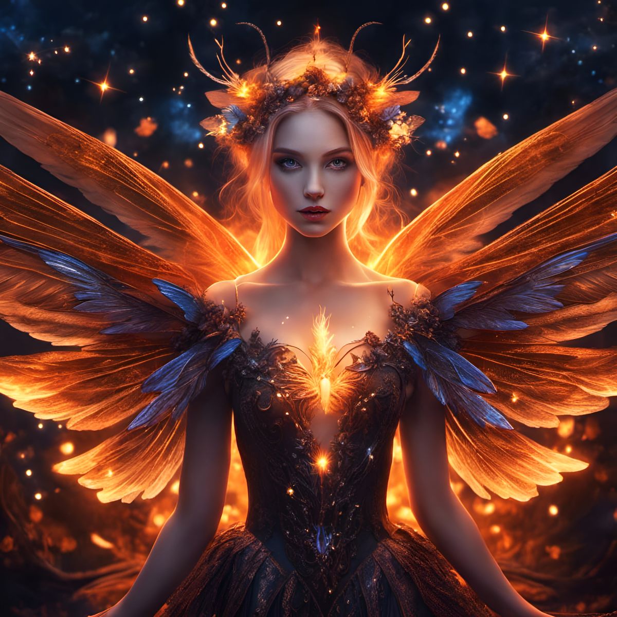 A striking picture of a winged woman surrounded by fire and stars. This fantasy image evokes a romantic and elegant fairy tale aesthetic with vibrant colors.