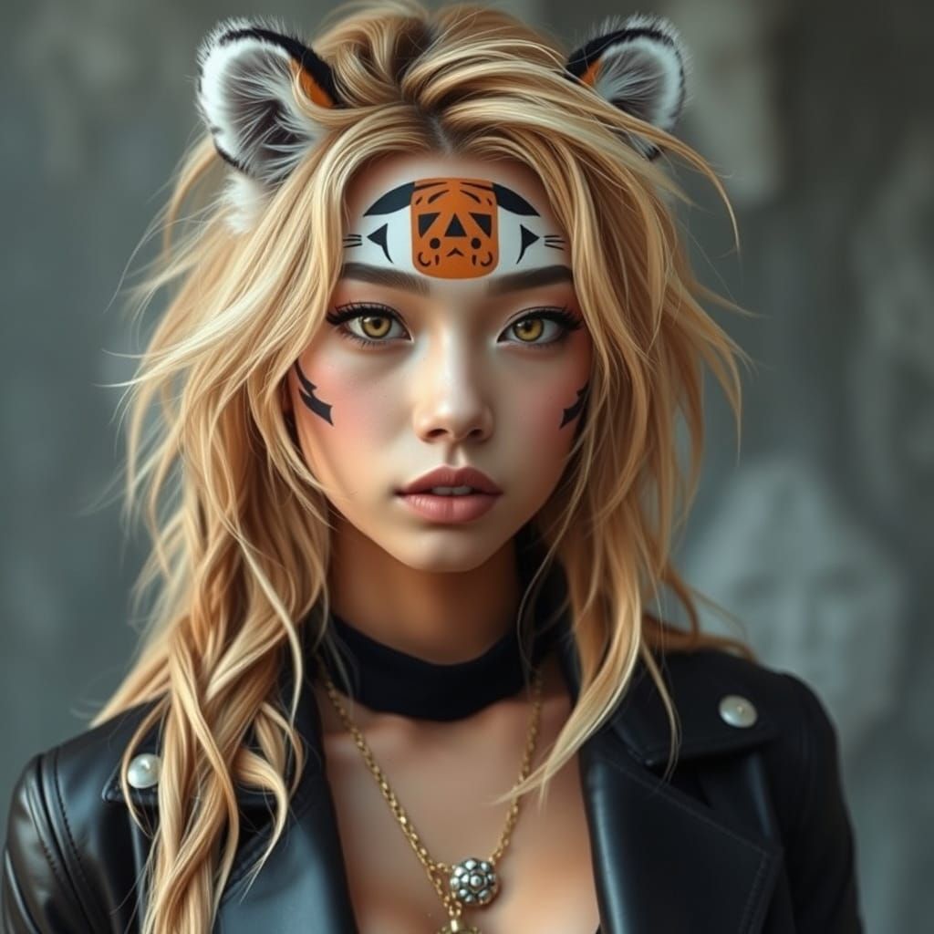This image shows a stylish, trans woman with a mysterious and charismatic presence. She has a rosy complexion, amber eyes, and a trendy, expensive aesthetic.