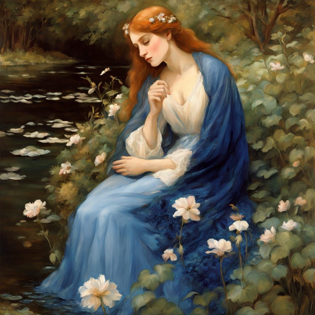 This image shows a Pre-Raphaelite style painting of a maiden by a river. The artwork features flowing fabrics, dense foliage, and luminous colors, creating a romantic and serene atmosphere.