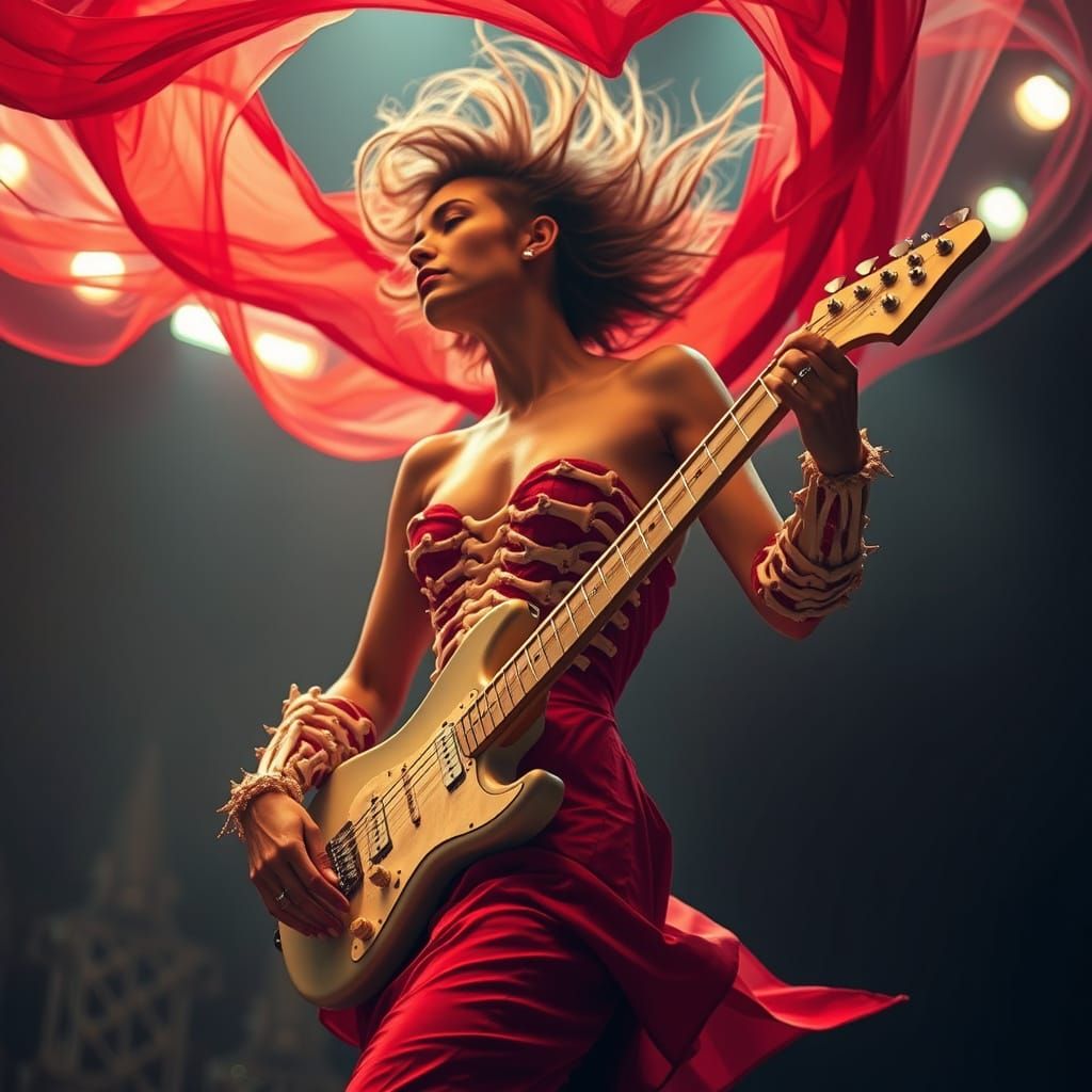 This image shows a woman undergoing a striking transformation. Her body morphs, with bone protruding to form an ivory-like exoskeleton armor in a mesmerizing display.