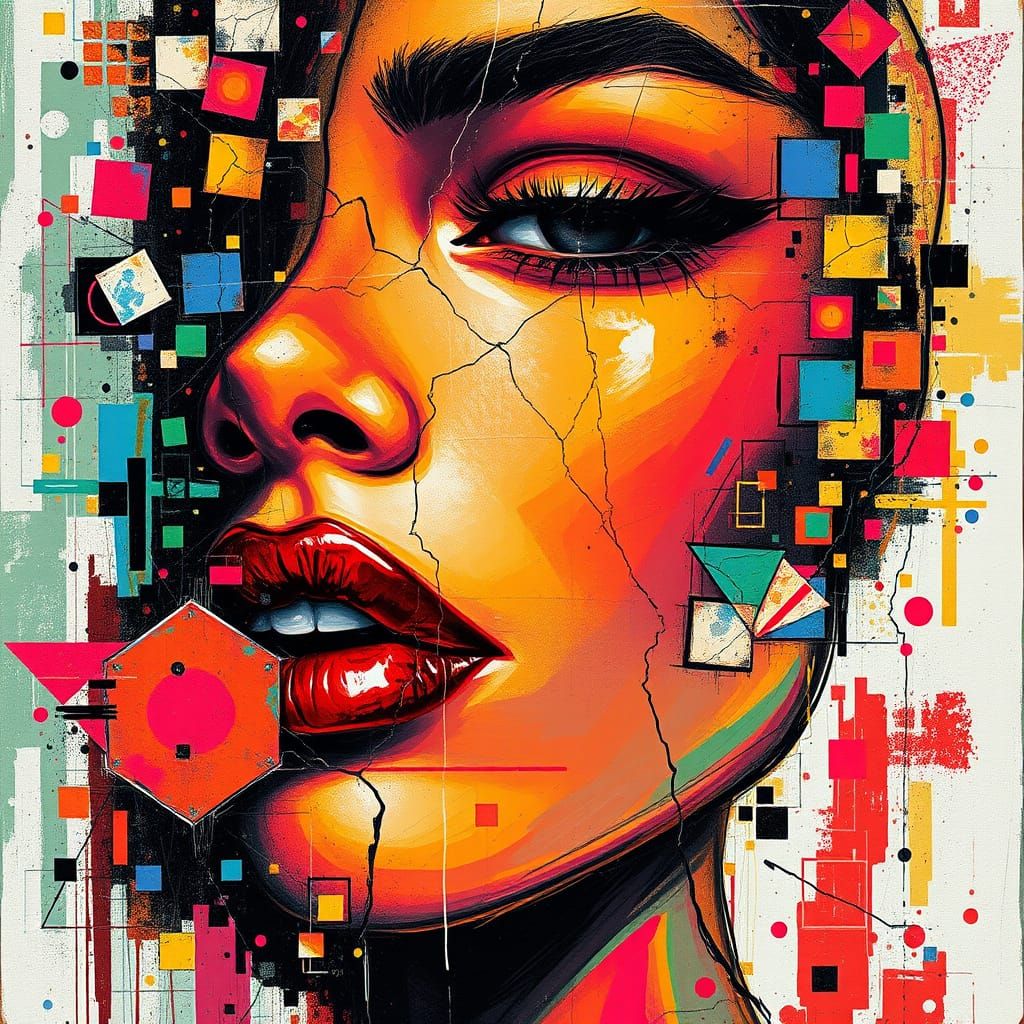 A vibrant portrait of a woman's face dissolving into cubes and dots. This pop art style image features geometric fragmentation, bold brushstrokes, and futuristic neon hues in a cubist aesthetic.