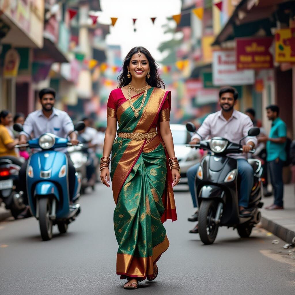 This image depicts a proud South Indian woman walking through a vibrant, decorated street filled with onlookers and scooters. A man admires her confidence and elegance.