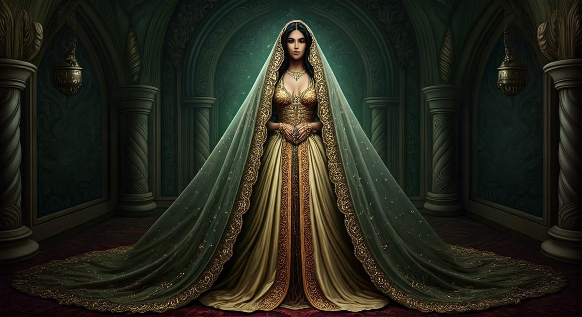 This image shows a beautiful Arab woman wearing an ornate gold gown and veil. The opulent scene evokes a mystical storybook world with surreal and symbolic elements in a baroque art deco style.